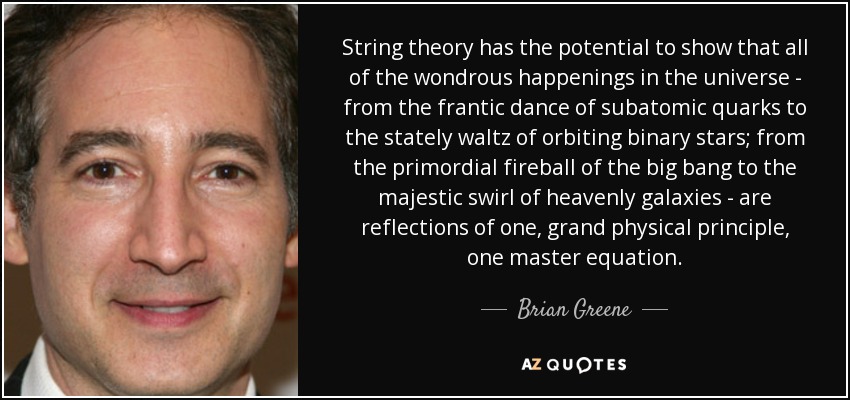 String theory has the potential to show that all of the wondrous happenings in the universe - from the frantic dance of subatomic quarks to the stately waltz of orbiting binary stars; from the primordial fireball of the big bang to the majestic swirl of heavenly galaxies - are reflections of one, grand physical principle, one master equation.