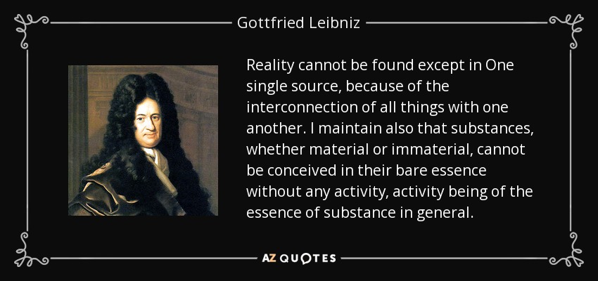 Reality cannot be found except in One single source, because of the interconnection of all things with one another. I maintain also that substances, whether material or immaterial, cannot be conceived in their bare essence without any activity, activity being of the essence of substance in general.