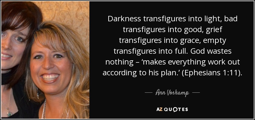 Darkness transfigures into light, bad transfigures into good, grief transfigures into grace, empty transfigures into full. God wastes nothing – ‘makes everything work out according to his plan.’ (Ephesians 1:11).