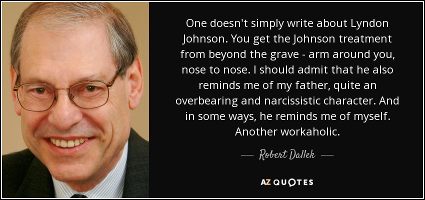 One doesn't simply write about Lyndon Johnson. You get the Johnson treatment from beyond the grave - arm around you, nose to nose. I should admit that he also reminds me of my father, quite an overbearing and narcissistic character. And in some ways, he reminds me of myself. Another workaholic.