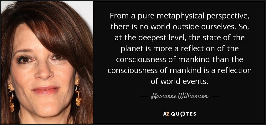 From a pure metaphysical perspective, there is no world outside ourselves. So, at the deepest level, the state of the planet is more a reflection of the consciousness of mankind than the consciousness of mankind is a reflection of world events.
