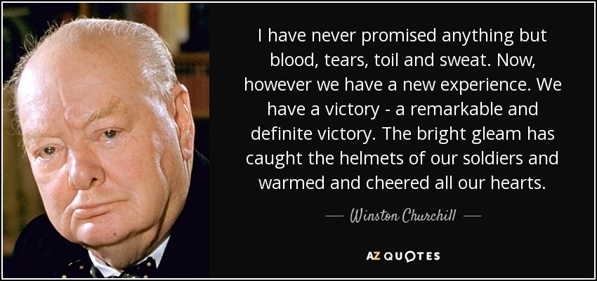 I have never promised anything but blood, tears, toil and sweat. Now, however we have a new experience. We have a victory - a remarkable and definite victory. The bright gleam has caught the helmets of our soldiers and warmed and cheered all our hearts.