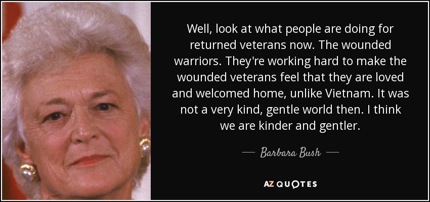 Well, look at what people are doing for returned veterans now. The wounded warriors. They're working hard to make the wounded veterans feel that they are loved and welcomed home, unlike Vietnam. It was not a very kind, gentle world then. I think we are kinder and gentler.