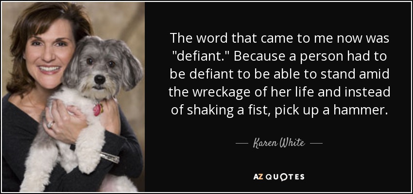 The word that came to me now was "defiant." Because a person had to be defiant to be able to stand amid the wreckage of her life and instead of shaking a fist, pick up a hammer.