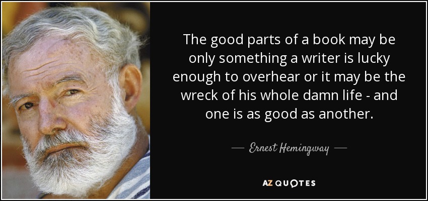 The good parts of a book may be only something a writer is lucky enough to overhear or it may be the wreck of his whole damn life - and one is as good as another.