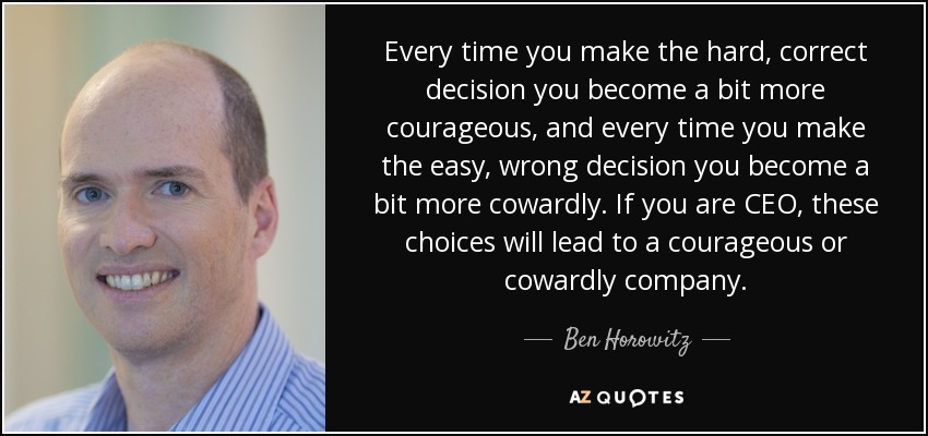 Every time you make the hard, correct decision you become a bit more courageous, and every time you make the easy, wrong decision you become a bit more cowardly. If you are CEO, these choices will lead to a courageous or cowardly company.