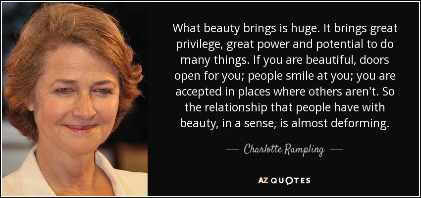 What beauty brings is huge. It brings great privilege, great power and potential to do many things. If you are beautiful, doors open for you; people smile at you; you are accepted in places where others aren't. So the relationship that people have with beauty, in a sense, is almost deforming.