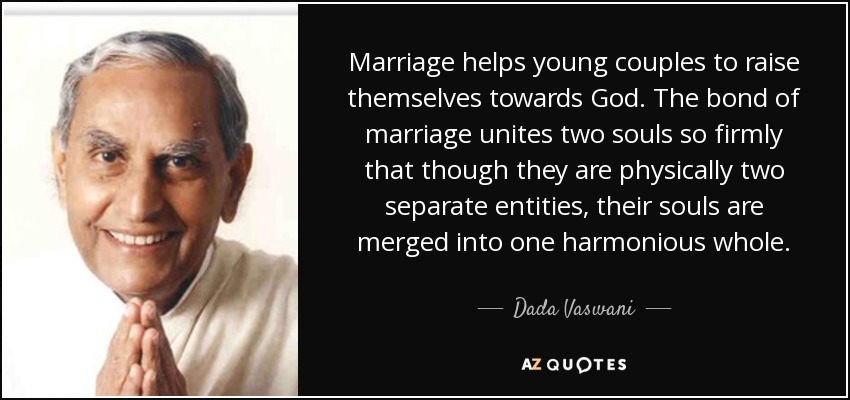 Marriage helps young couples to raise themselves towards God. The bond of marriage unites two souls so firmly that though they are physically two separate entities, their souls are merged into one harmonious whole.