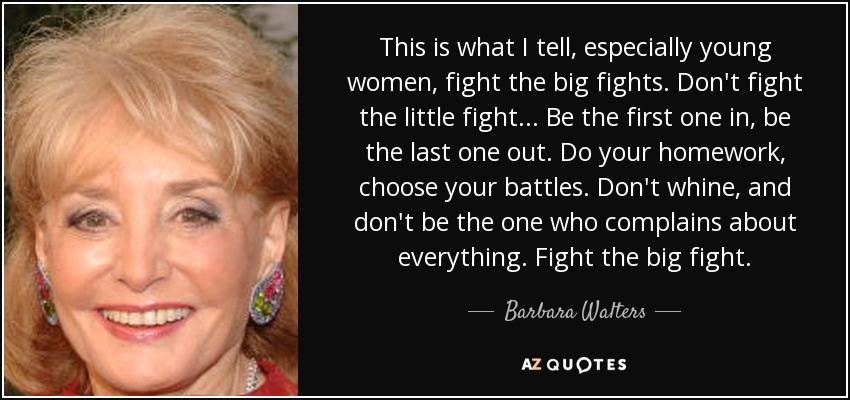 This is what I tell, especially young women, fight the big fights. Don't fight the little fight... Be the first one in, be the last one out. Do your homework, choose your battles. Don't whine, and don't be the one who complains about everything. Fight the big fight.
