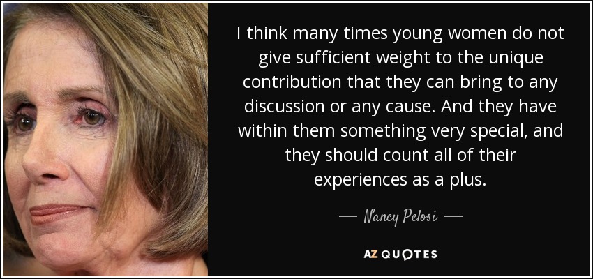 I think many times young women do not give sufficient weight to the unique contribution that they can bring to any discussion or any cause. And they have within them something very special, and they should count all of their experiences as a plus.