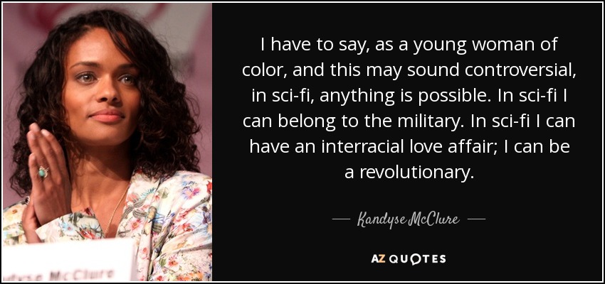 I have to say, as a young woman of color, and this may sound controversial, in sci-fi, anything is possible. In sci-fi I can belong to the military. In sci-fi I can have an interracial love affair; I can be a revolutionary.