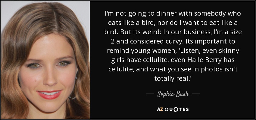 I'm not going to dinner with somebody who eats like a bird, nor do I want to eat like a bird. But its weird: In our business, I'm a size 2 and considered curvy. Its important to remind young women, 'Listen, even skinny girls have cellulite, even Halle Berry has cellulite, and what you see in photos isn't totally real.'