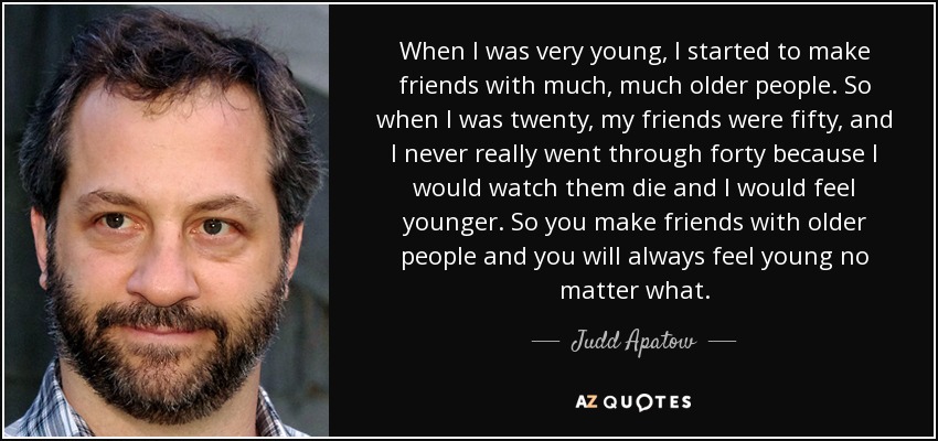 When I was very young, I started to make friends with much, much older people. So when I was twenty, my friends were fifty, and I never really went through forty because I would watch them die and I would feel younger. So you make friends with older people and you will always feel young no matter what.